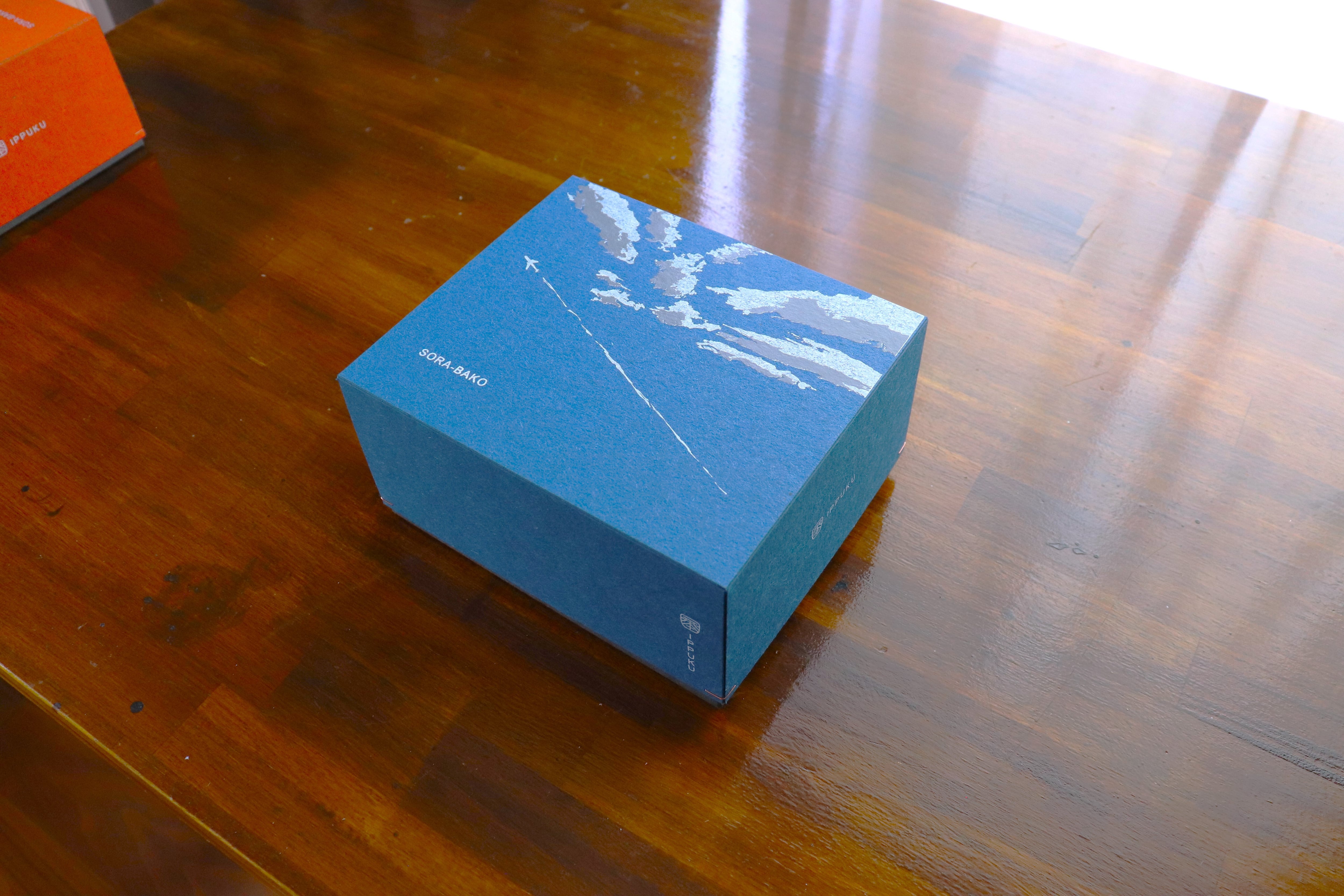 お楽しみいただきたく、晴天と夕空をイメージしたデザインの箱に、